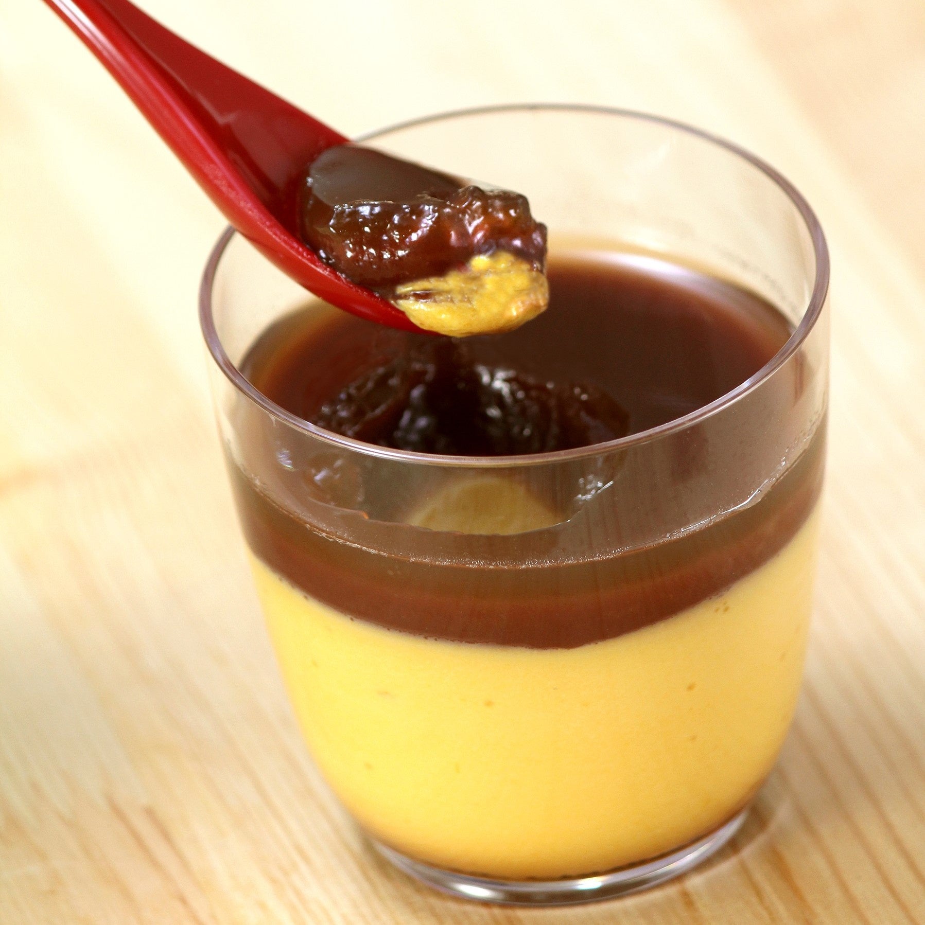 上掛けは船橋屋ならではのこし餡と黒蜜で仕上げた和風ゼリー。プリンの底にはカラメルも入っています。