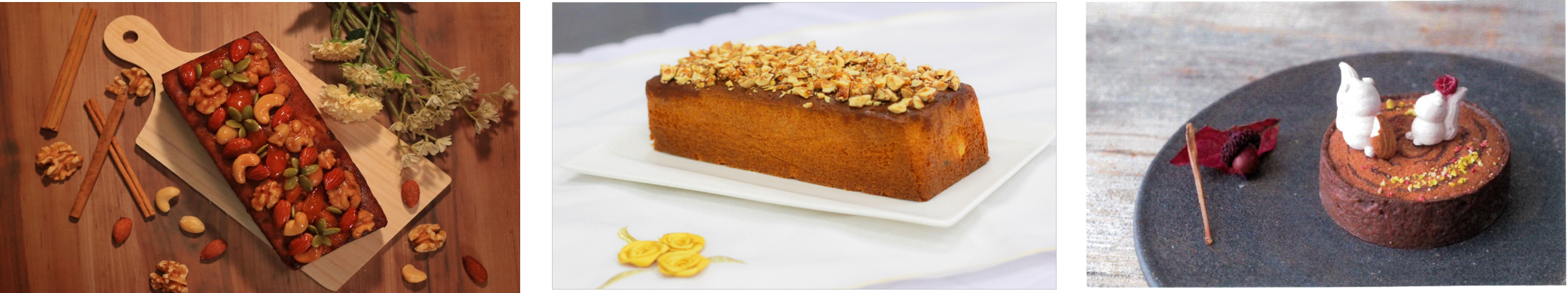 また、料理好きな高校生たちの自己表現の場として同時開催された「高校生スイーツレシピ+フォトチャレンジ」部門には、589件もの応募がありました。厳正なる審査の結果、三ツ星レシピ賞には、おかやま山陽高等学校2年溝口萌音さん「ハニースマイル!~キンカンとハニーナッツのパウンドケーキ~(写真左)」、昭和学園高等学校2年永田乙葉さん、2年北原杏美さん「ガトーノワゼット(写真中央)」、レコールバンタン高等部東京校2年大嶋沙紀さん・2年仲宗根波琉さん「りすの日常(写真右)」の3作品が輝きました。