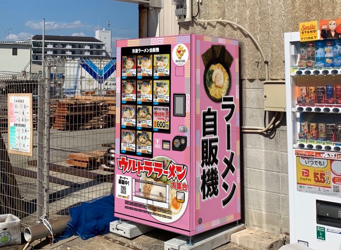 ウルトラフーズ株式会社(所在地:横浜市中区、代表取締役:松野克成、以下「当社」)は、「横浜家系ラーメン松壱家」や「THE GOLDEN RAMEN ゴル麺。」で提供している自社製造のラーメンを冷凍自動販売機「ど冷えもん」を用いて販売する自動販売機事業【ウルトララーメン大集合】の125号店、大阪府摂津市鳥飼銘木町にオープンしました。