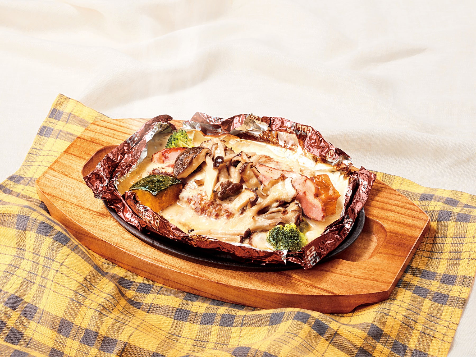しめじ、舞茸、エリンギの3種のきのことクリームソースを使用した包み焼きハンバーグです。たっぷりきのこに加え、香り高い燻製ベーコン、秋に旬を迎えるほくほくのかぼちゃなどをごろっと入れ、食べ応えのある商品に仕上げました。アルミホイルを開けた瞬間から広がるきのこの濃厚な香りとベーコンのスモーキーな香りが食欲をそそります。チーズが溶け込んだクリームソースに、ハンバーグや具材を絡めて秋の味覚たっぷりの包み焼きハンバーグを心ゆくまでお楽しみください。テイクアウト可能商品のため、お家でもお楽しみいただけます。