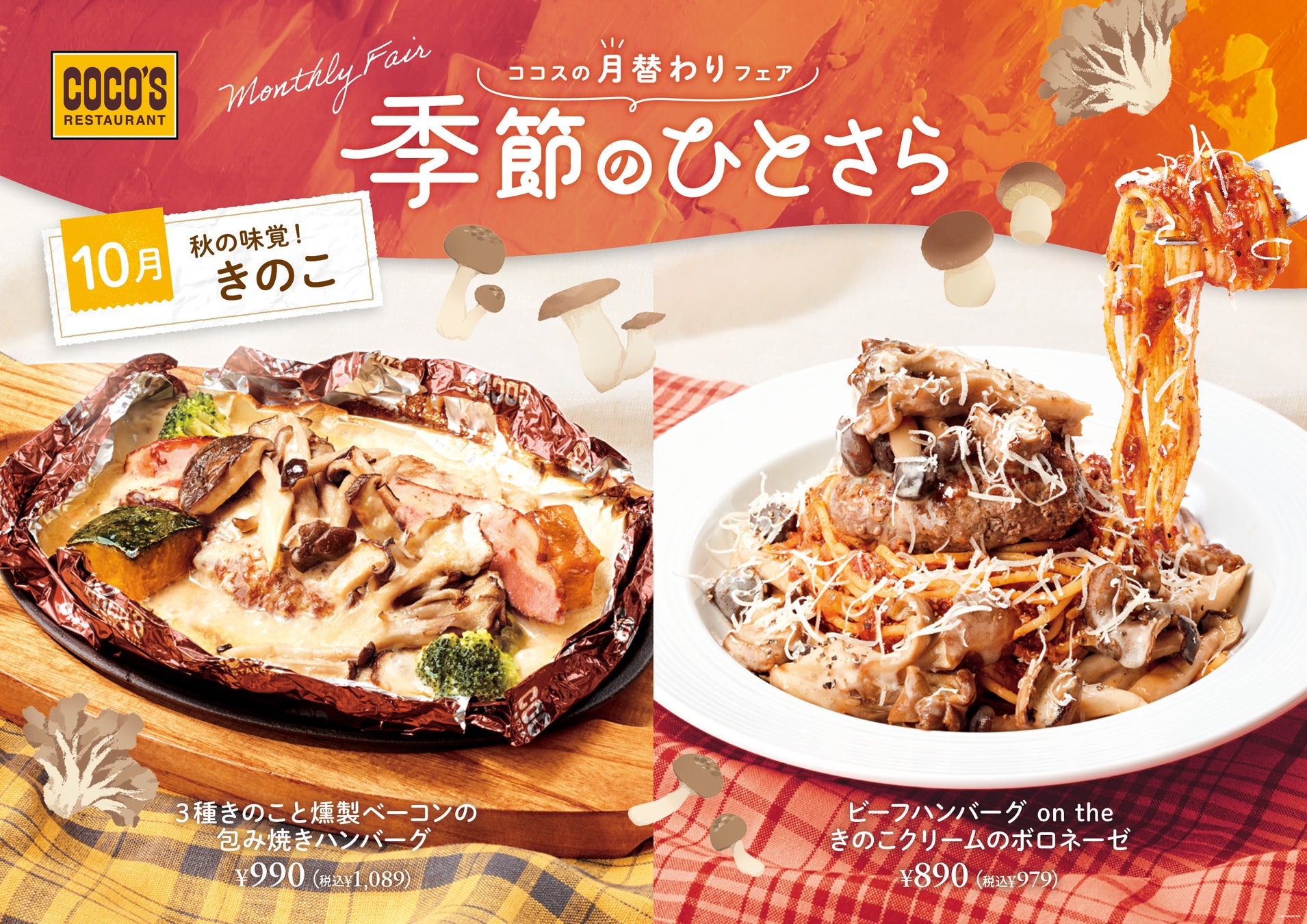 株式会社ココスジャパン(代表取締役社長:一木 直哉 本社:東京都港区)が全国に展開するファミリーレストラン「ココス」では10月1日(土)より、月替わりフェア「季節のひとさら~10月~」を開催します。10月のテーマは秋の味覚“きのこ”です。
