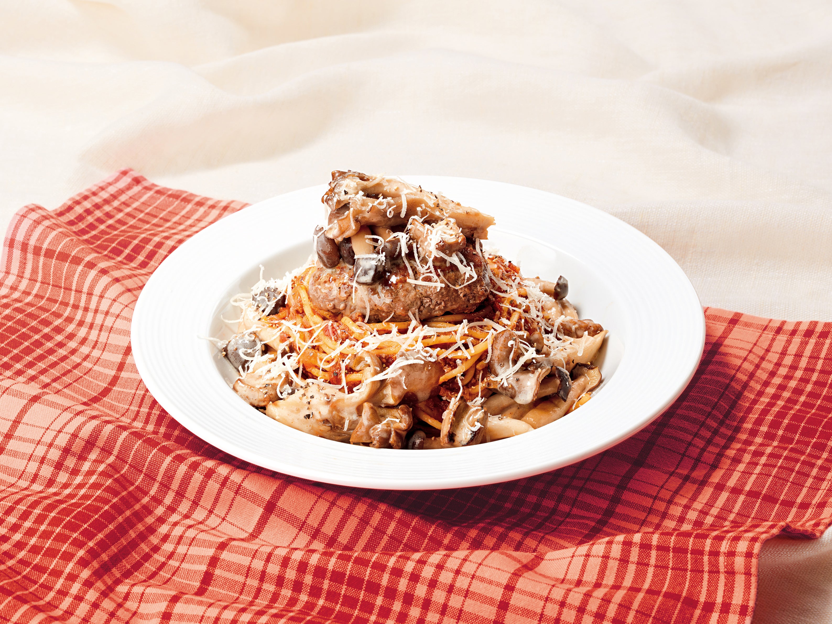 牛肉を100%使用したビーフハンバーグをのせたボロネーゼに、3種のきのこがたっぷり入ったポルチーニ香るきのこクリームソースをかけたボリューム満点の一品です。ビーフハンバーグを豪快に崩し、お客様自身でボロネーゼを完成させてお召し上がりいただけます。きのこクリームソースには、しめじと舞茸に加えてポルチーニが入っており、ボロネーゼに芳醇な風味をプラスします。見た目・香り・味わいと、五感でお楽しみいただける商品です。パスタは、1.5倍盛り(+税込110円)や低糖質パスタ(+税込110円)にも変更可能です。