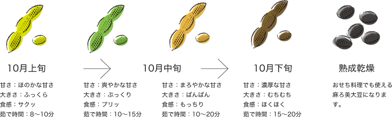 一般的な枝豆とは違い、品種の特性上毎年10月にしか収穫できない特別な枝豆である。また、特徴として粒の大きさ、甘味、食感が挙げられ、どれをとっても極上だ。