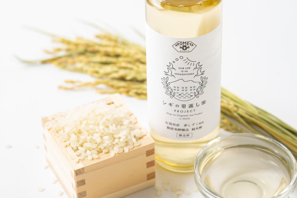 「アコメヤの木桶味噌」プロジェクトのご縁から新商品が生まれました。粒の大きさが不揃いな「シギの恩返し米」のくず米を原料に、134年間守り続けてきた「河野酢味噌製造工場」の酢酸菌で丁寧に造られた伝統製法の純米酢。環境に配慮した原料と伝統の技の共演をお楽しみください。