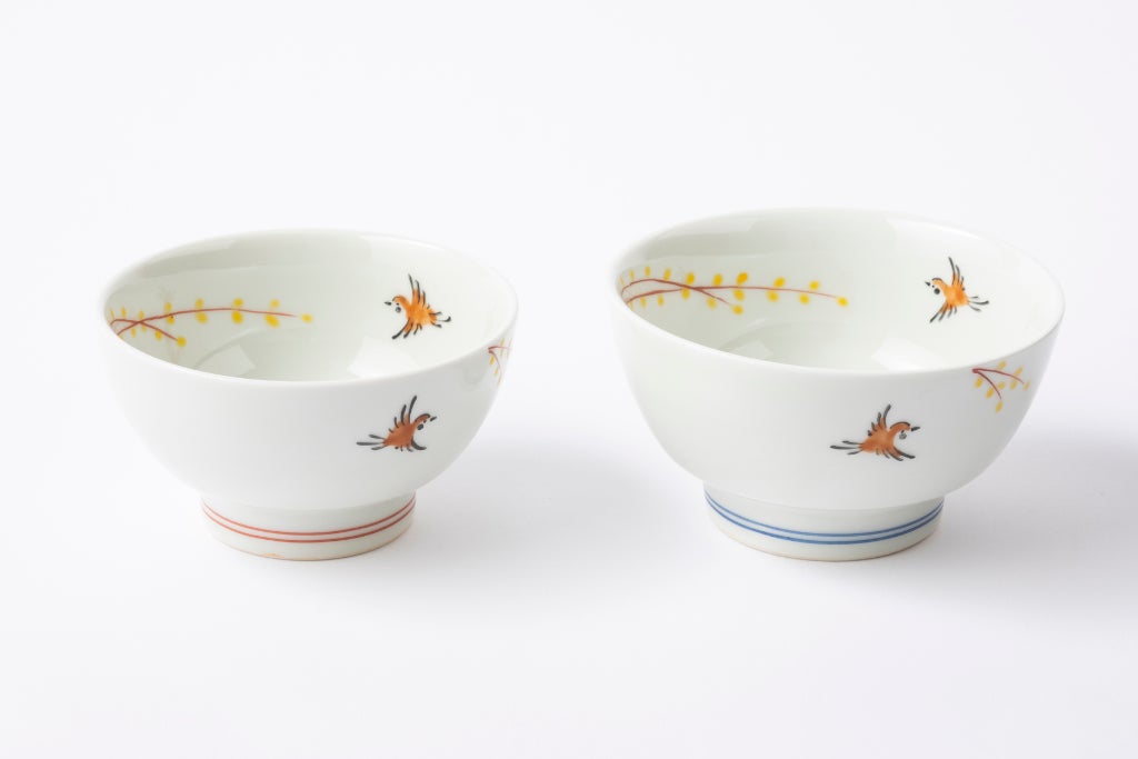 波佐見焼の飯椀に黄金色に実った稲穂と五穀豊穣の象徴である雀を繊細な絵付で表現しました。 職人が一筆一筆丁寧に手書きで絵付を施しています。大小合わせて夫婦茶碗として、贈答用にもおすすめです。白箱入り。