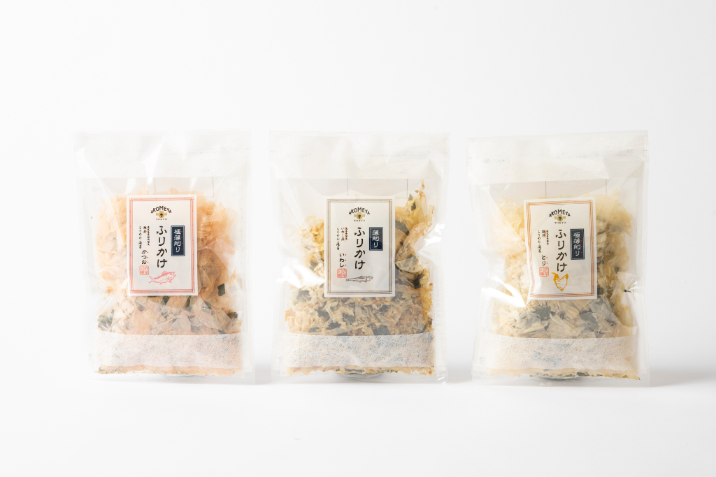 0.01mmという極薄削りの節を使用し、海苔とちりめんを加えたふわふわのふりかけです。かつお、とり、いわしの3種類で、いわしは0.03mmの薄削り。素材そのものの風味をお楽しみください。お好みに応じて醤油を垂らしても美味しくお召し上がりいただけます。