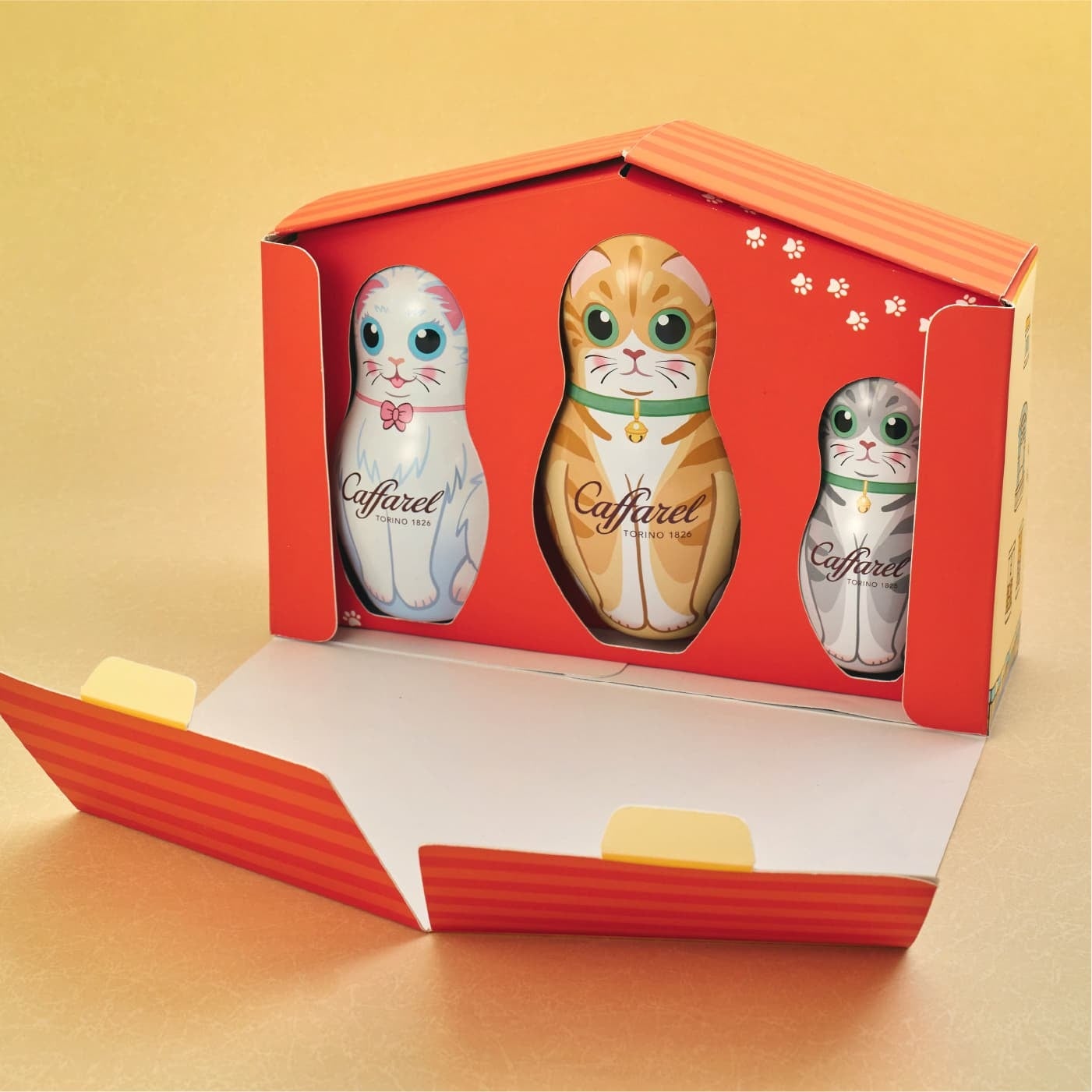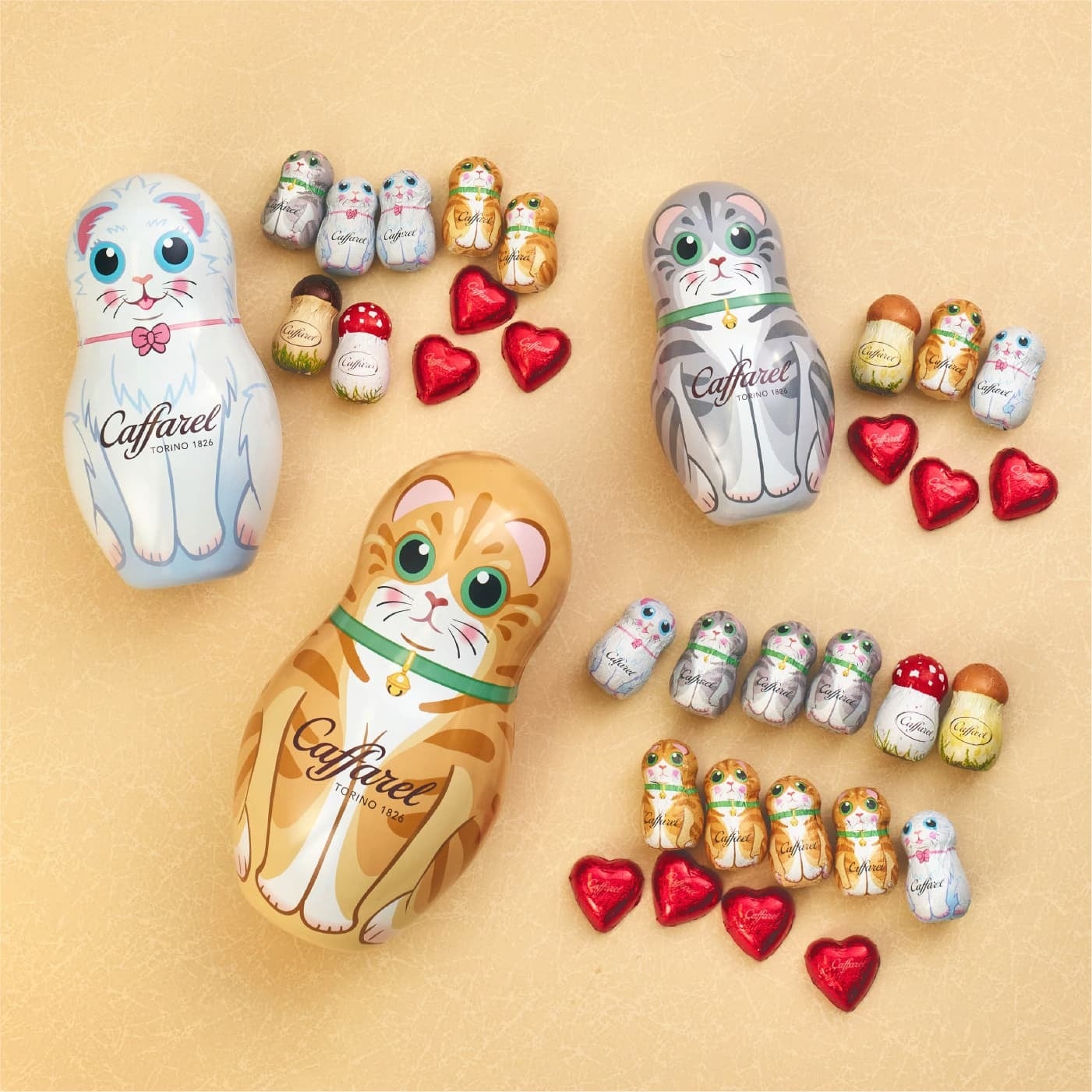 内容:カファレルで人気のネコのホイルチョコレート「キャット」がそのままマトリョーシカ型の缶になった、缶マニア必見の商品。S、M、Lサイズ3個セットで販売。缶と同じイラストのネコのホイルチョコレートをはじめ、キノコのホイルチョコレート、ホログラムが入った美しいホイルのミニハートの3種のチョコレートをそれぞれアソートしました。本場のマトリョーシカ同様、ひとつの缶に収まるようになっています。