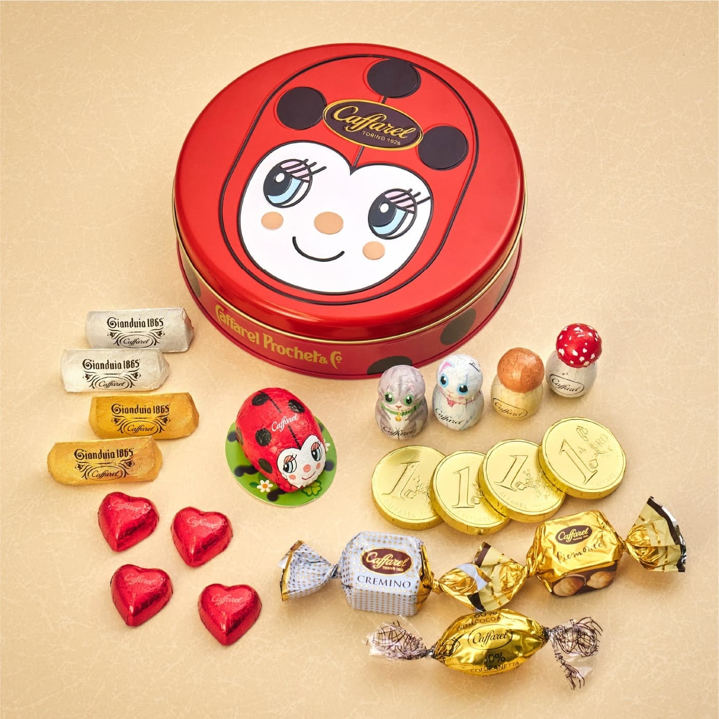 内容:カファレルのロングセラー商品「チョコラティーノ」に特大サイズが登場。缶に描かれた愛らしい表情のてんとう虫のイラストはそのままに、カファレルの代名詞であるジャンドゥーヤをはじめ、てんとう虫のホイルチョコレートや、食べ応え満点のピエモンテ、カカオニブが入ったカカオポットダークなど、合計20粒アソートしました。思わず2サイズセットで揃えたくなる可愛さです。お子さまへのプレゼントにもおすすめです。