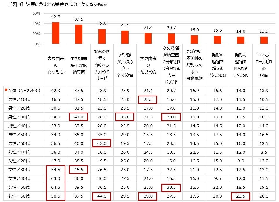 3位は「発酵の過程で作られるナットウキナーゼ」(28.9%)で、男女とも60代(男性(42.0%)、女性(44.0%))から多くの関心を集めています。