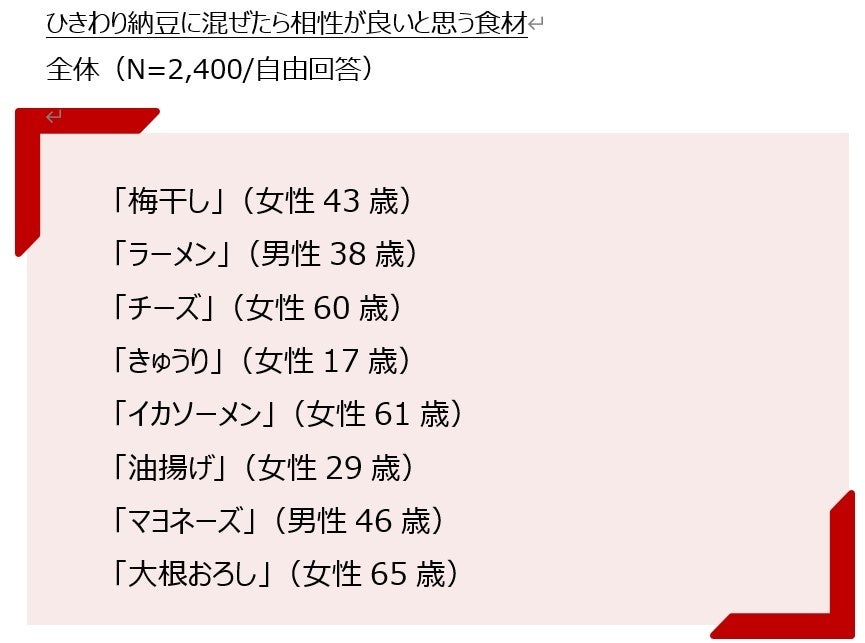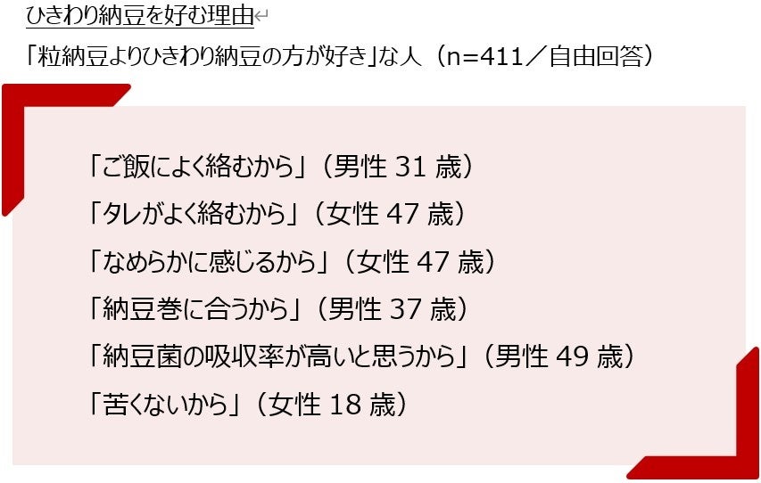 自由回答をみると、「ご飯によく絡むから」(男性31歳)、「タレがよく絡むから」(女性47歳)と、ひきわり納豆の「絡みやすさ」を挙げる人が多く、また、「納豆巻に合うから」(男性37歳)という声も集まりました。
