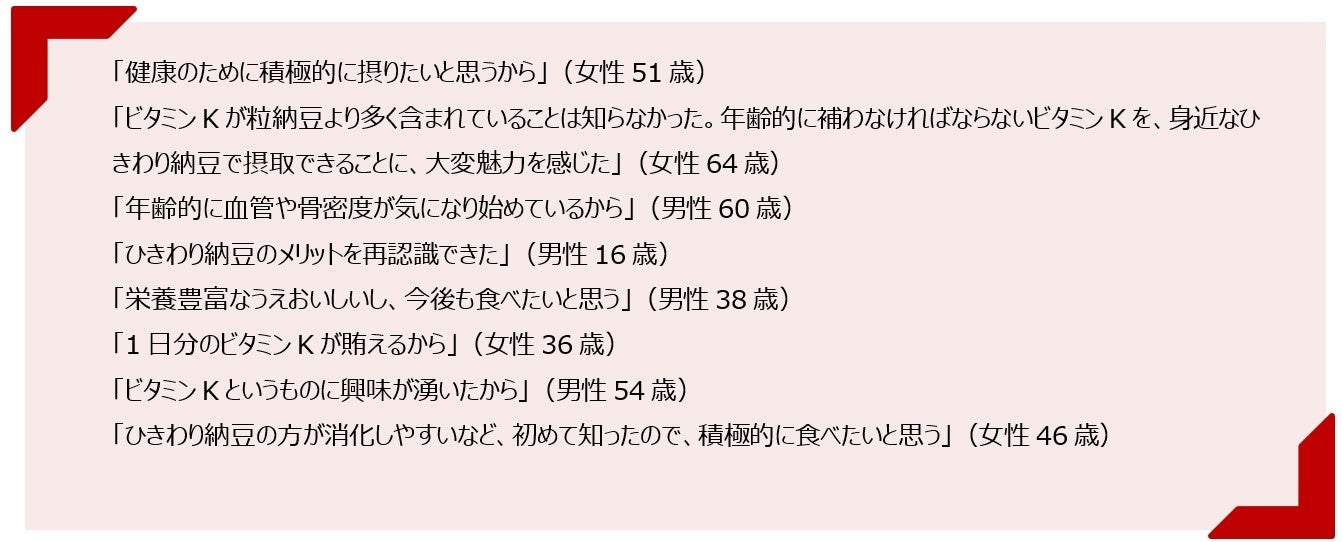 自由回答で理由をみると、「ビタミンKが粒納豆より多く含まれていることは知らなかった。年齢的に補わなければならないビタミンKを、身近なひきわり納豆で摂取できることに、大変魅力を感じた」(女性64歳)、「ビタミンKというものに興味が湧いたから」(男性54歳)など、年齢や性別を問わず、ひきわり納豆に含まれる豊富な「ビタミンK」は、ひきわり納豆の新たなる