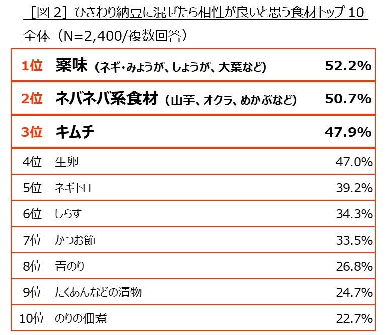 「絡まりやすさ」への評価も高いひきわり納豆ですが、納豆を1カ月に1回以上食べる人が「ひきわり納豆に混ぜたら合う」と感じている、相性の良い食材にはどのようなものがあるのでしょうか。最も人気だったのは「薬味(ネギ、みょうが、しょうが、大葉など)」(52.2%)で、半数以上の人の支持を集めました。僅差で2位となったのは「ネバネバ系食材(山芋、オクラ、めかぶなど)」(50.7%)で、ネバネバ食材同士を合わせて楽しむ人も多いようです。3位は「キムチ」(47.9%)で、辛味・酸味のアクセントを好む人も多いようです[図2]。