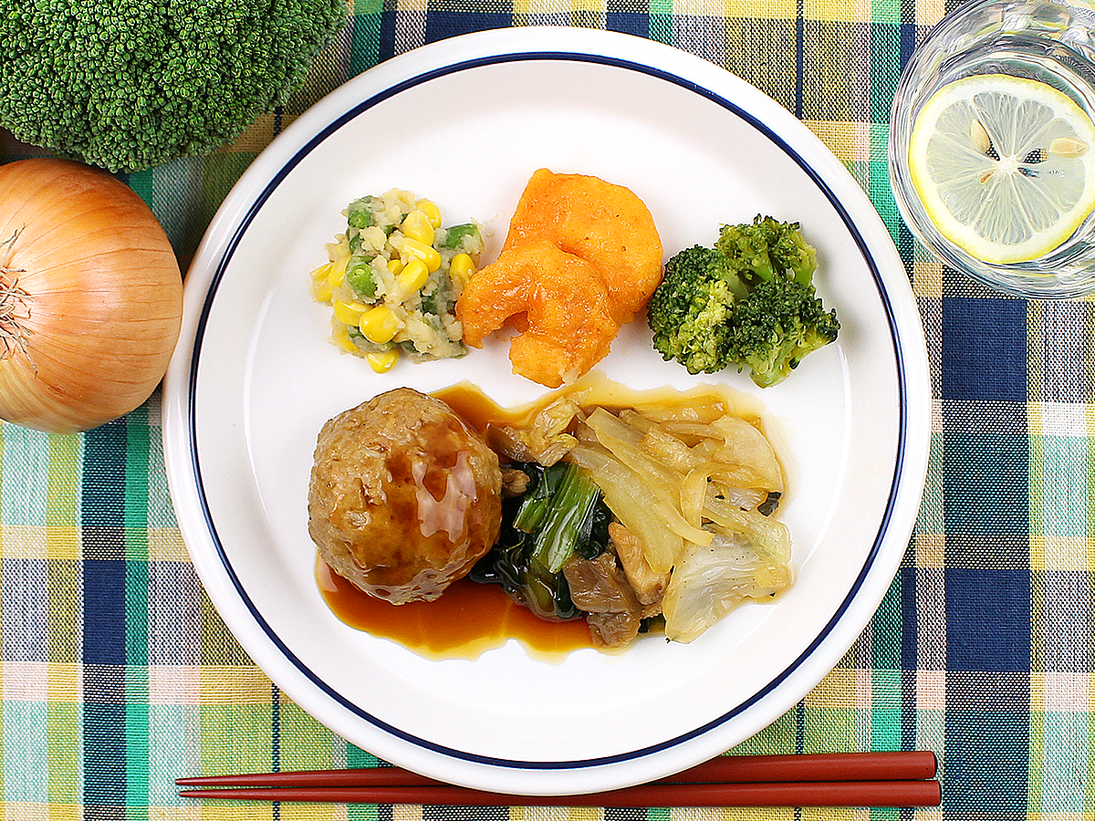 大ぶりでレンコンのシャキシャキ食感が特徴である鶏肉の肉団子と、たっぷりの添え野菜を甘酢あんでお召し上がりください。添え野菜には白菜、ほうれん草、玉ねぎ、ひらたけを使用しております。