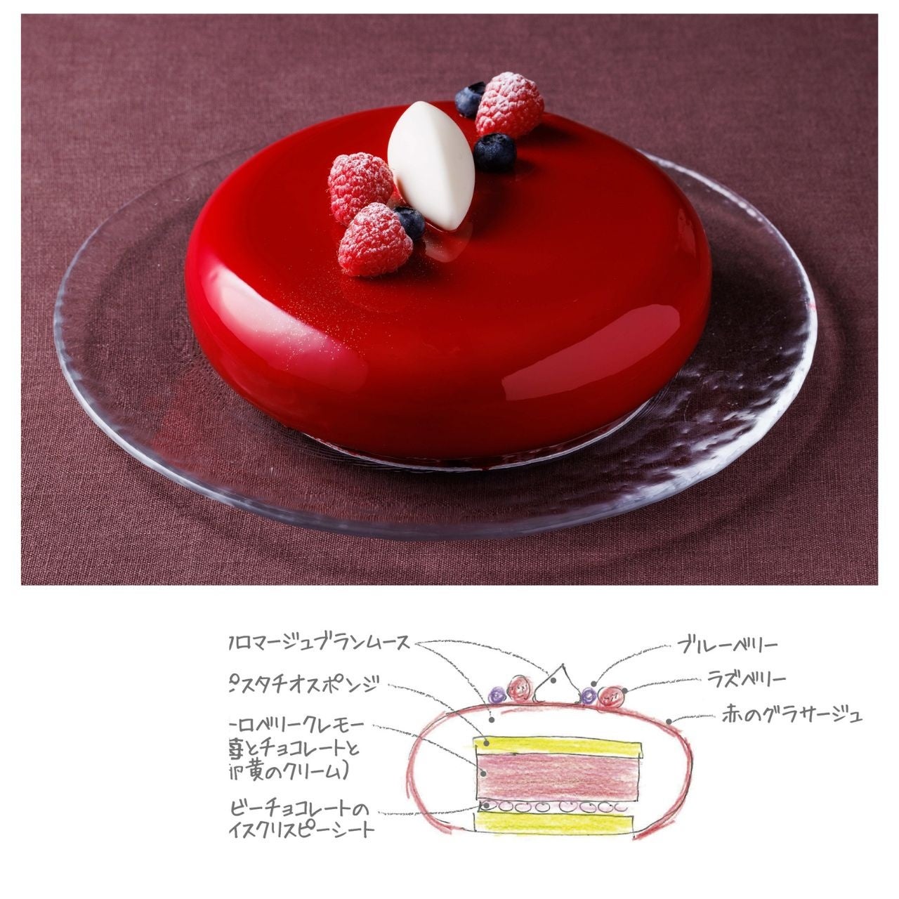 気品に満ちたつややかな光沢が美しい、赤い果実の輝くグラサージュで仕上げたクリスマスケーキ。ストロベリークレモー(苺、チョコレート、卵黄のクリーム)、ルビーチョコレートをピスタチオスポンジで挟み、フロマージュブランムースの中に閉じ込めました。お口の中に広がる爽やかで豊かな香り、食感をお楽しみください。