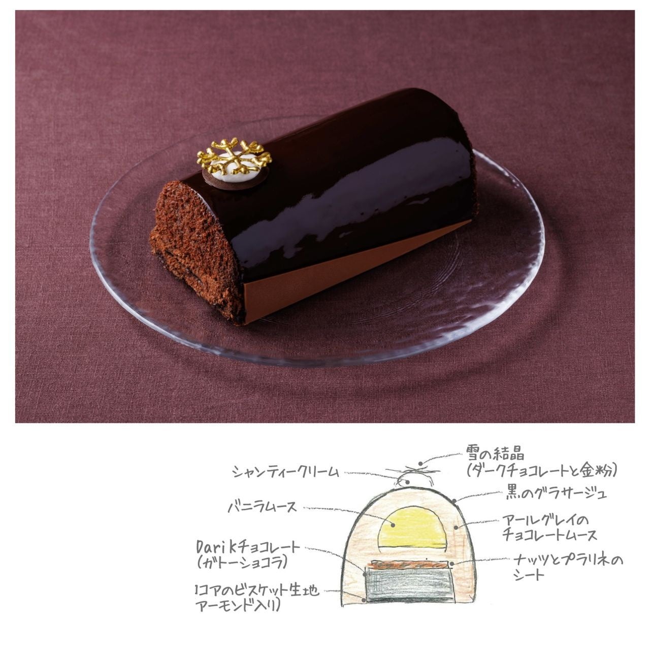 現地指導により栽培から収穫、加工までの作業を全て管理するインドネシアの契約農場で栽培されたカカオ豆と砂糖だけで作る京都のチョコレート専門店「Dari K (ダリケー)」のチョコレートを使ったガトーショコラとバニラムースを、アールグレイ風味のチョコレートムースで包み込みました。チョコレートのグラサージュで仕上げた大人のクリスマスケーキです。