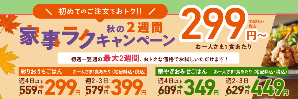 これから「あっ!と ごはん」を始める方は、週4日以上のご注文でお1人さま1食あたり299円よりご注文できる「秋の2週間家事ラクキャンペーン」をご利用いただけます。初週+翌週の最大2週間、おトクな価格でお試しいただけますので、ぜひこの機会にご利用ください。