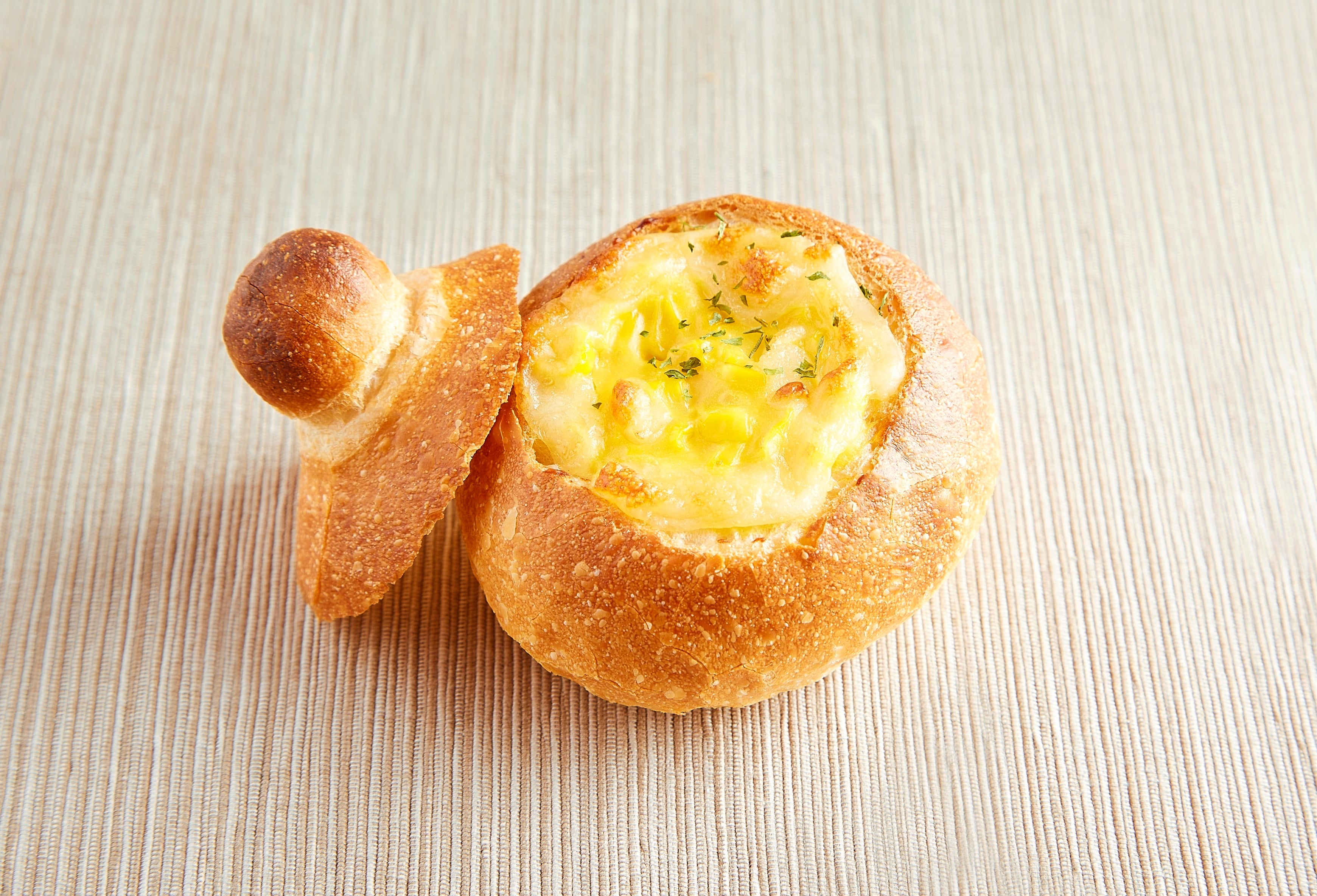 小さなお鍋の形をしたフランスパンの中には、つぶつぶのコーンポタージュがたっぷり。