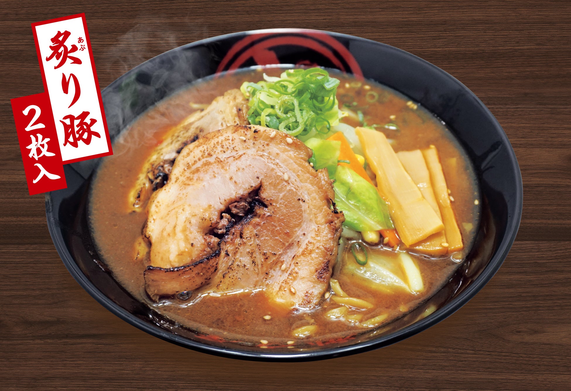 表面にサッと香ばしい焼き目をつけたトロトロの炙り豚を2枚トッピングし、食べ応え抜群の一杯です。