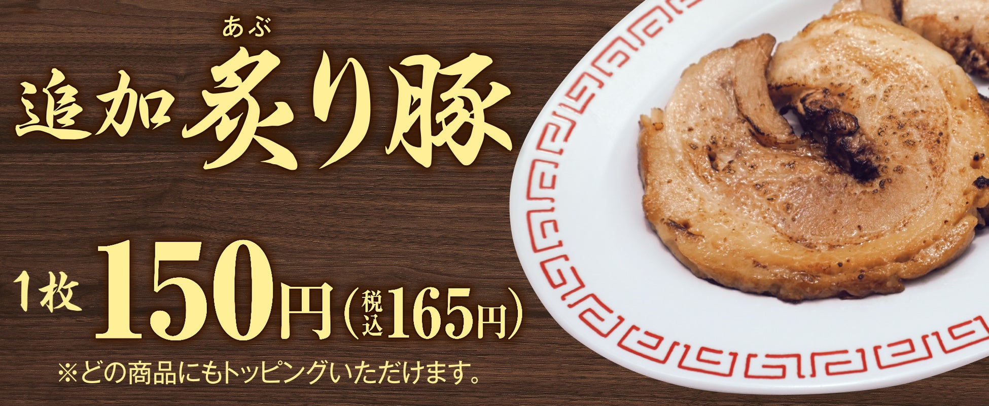 「炙り豚」は1枚から追加でご注文いただくことができ、どのラーメンにもトッピング可能です。