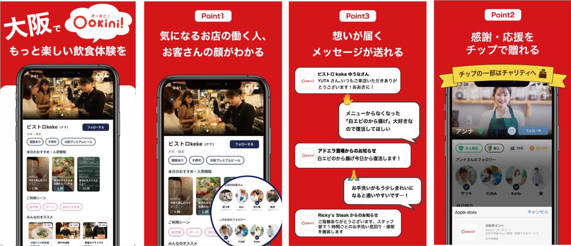 株式会社データインサイト (本社:東京都渋谷区) と、株式会社大阪メトロ アドエラ(本社:大阪市西区)は、”お客さんの声” と “デジタルチップ” を用いて飲食店を盛り上げるウェブサービス Ookini!(オーキニ)のβ版アプリを用いたトライアルを開始します。トライアル期間は2022年10月1日~12月31日の3か月間、対象エリアは大阪市内とし、また、トライアルキャンペーンとしてOokini!利用者向けに「100万円分ポイント山分けキャンペーン」を展開します。