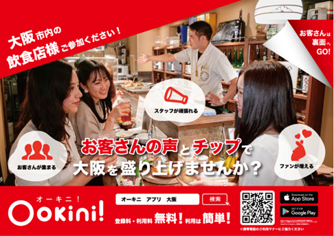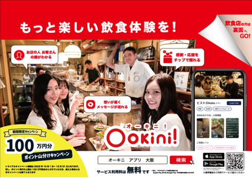 株式会社データインサイト (本社:東京都渋谷区) と、株式会社大阪メトロ アドエラ(本社:大阪市西区)は、”お客さんの声” と “デジタルチップ” を用いて飲食店を盛り上げるウェブサービス Ookini!(オーキニ)のβ版アプリを用いたトライアルを開始します。トライアル期間は2022年10月1日~12月31日の3か月間、対象エリアは大阪市内とし、また、トライアルキャンペーンとしてOokini!利用者向けに「100万円分ポイント山分けキャンペーン」を展開します。