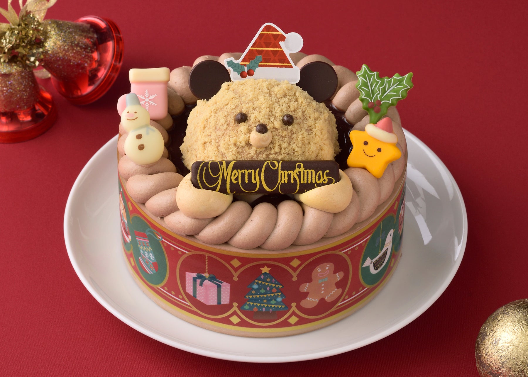 ミルクチョコムースにふわふわのキャラメルスポンジクラムをのせて、クリスマスプレゼントの“くまのぬいぐるみ”を表現しました。土台はミルクチョコクリームをココアスポンジでサンドして、サクサクのアーモンドチョコクランチを食感のアクセントに♪