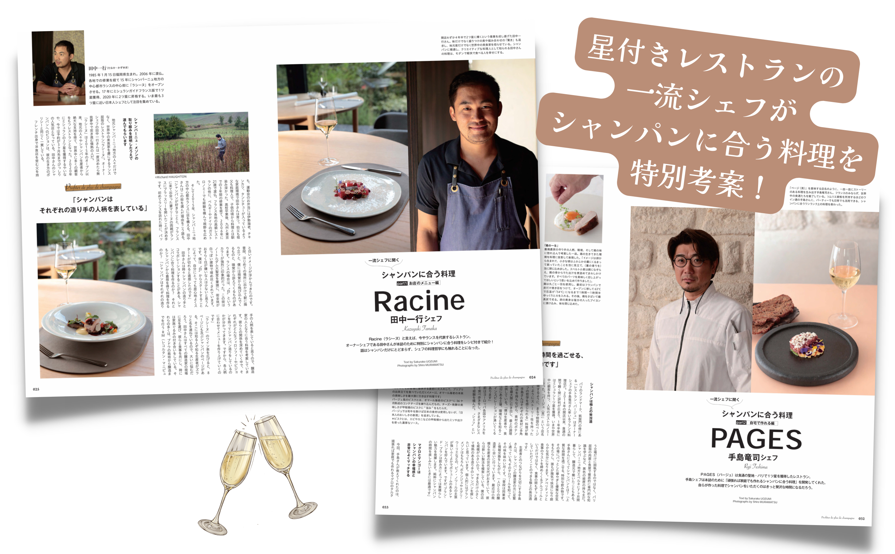 「シャンパンと一緒に食べる料理で失敗したくない」「いきなりボトルで購入するのは怖い」「自分の好みのシャンパンを知りたい」……。そんな方のために、シャンパンの味を知り尽くしている星付きレストランのシェフが特別に本誌のためにシャンパンに合う料理をアドバイス。「ラシーヌ(ランス)」の田中シェフ、「パージュ(パリ)」の手島シェフによる、すぐに使える貴重なレシピ付きです。また、都内で気軽にシャンパンが飲めるお勧めの4店を紹介します。