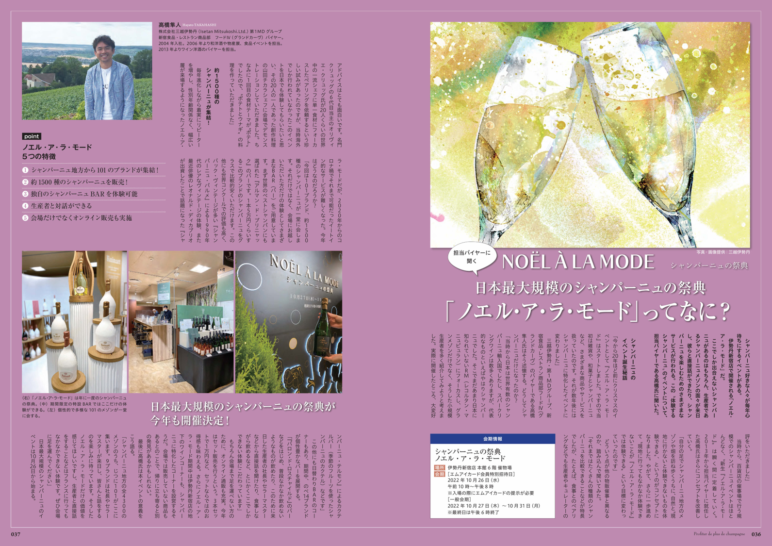 年に一度伊勢丹新宿店で開催される「ノエル・ア・ラ・モード」は、日本最大規模のシャンパーニュの祭典。ここでしか出合えないシャンパーニュがあるのはもちろん、生産者であるシャンパーニュメゾンの面々が来日し、彼らと直接話ができたり、シャンパーニュを楽しむためのさまざまなサービスが行われる “体験するシャンパーニュ”のイベントです。本誌に掲載されている商品は、当イベントでも取り扱っています(一部例外あり)。