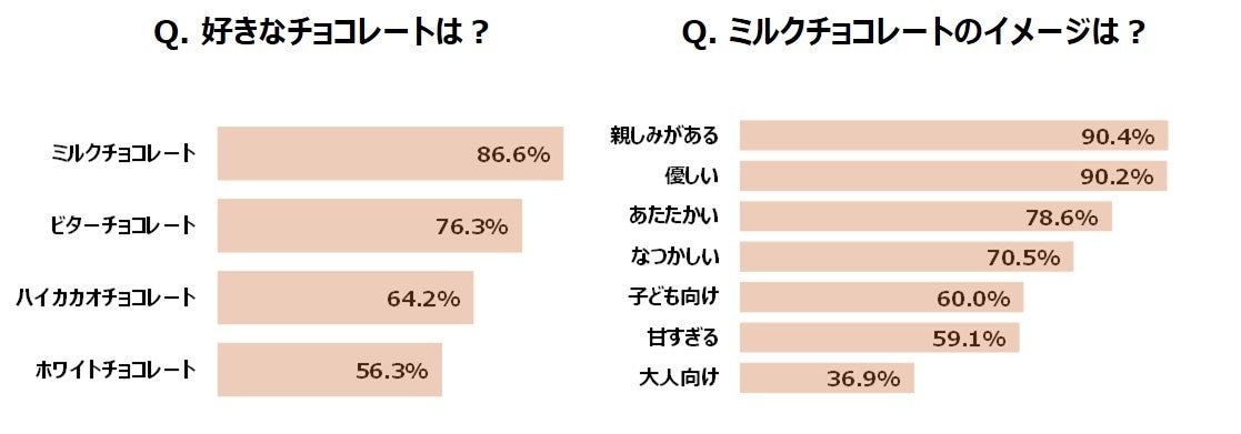 各チョコレートをどの程度好きかお聞きしたところ、「とても好き」、「やや好き」と回答した方が最も多いチョコレートは「ミルクチョコレート」となり86.6%の方が回答しました。ミルクチョコレートには「親しみがある」、「優しい」、「あたたかい」といイメージがある一方で「子ども向け」と感じているチョコレート好きも多いようです。
