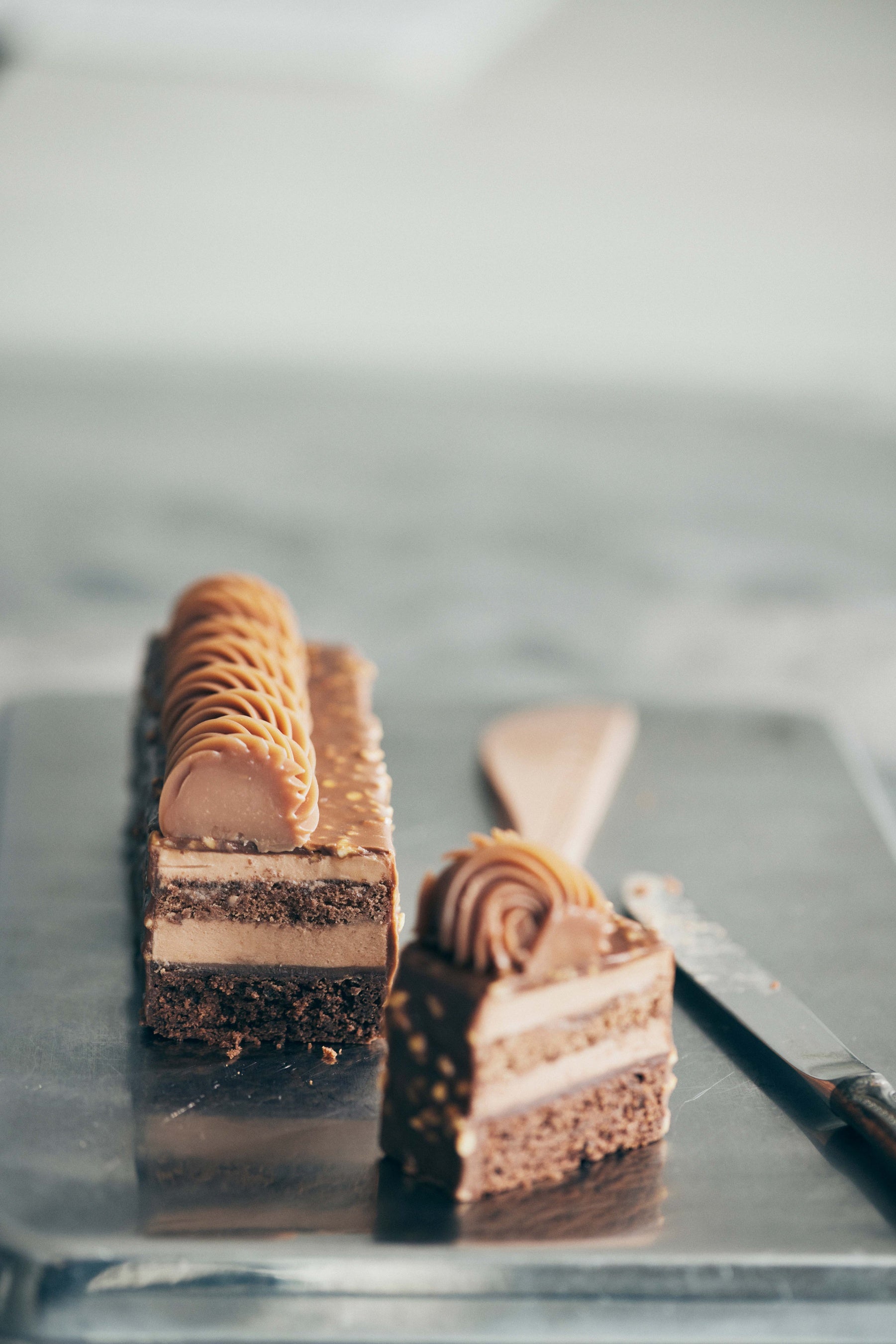トンカ豆の甘く上品な香りを移したガナッシュをしっとりとしたガトーショコラに重ね、底に忍ばせたヘーゼルナッツのプラリネをアクセントに。