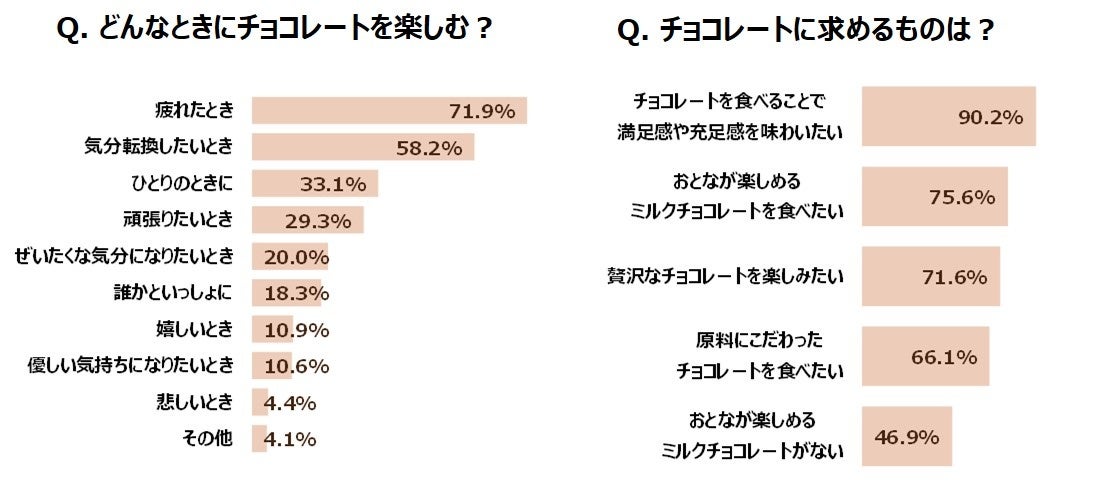また「チョコレートを食べることで満足感や充足感を味わいたい」90.2%、「おとなが楽しめるミルクチョコレートを食べたい」75.6%など、おとなのチョコレート好きは甘さだけではなく、さまざまなものをチョコレートに求めているようです。