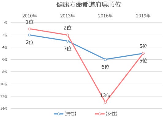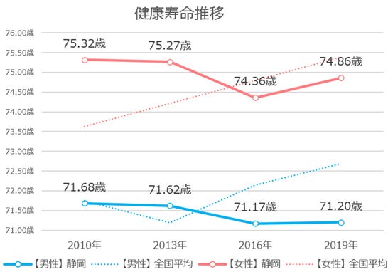 厚労省簡易生命表の発表によると、静岡県は、2010年に女性が第1位、男性が第2位だったものの、現在は双方とも5位(女性:74.86歳 男性:71.2歳)に下がってしまっております。(以下グラフ参照)