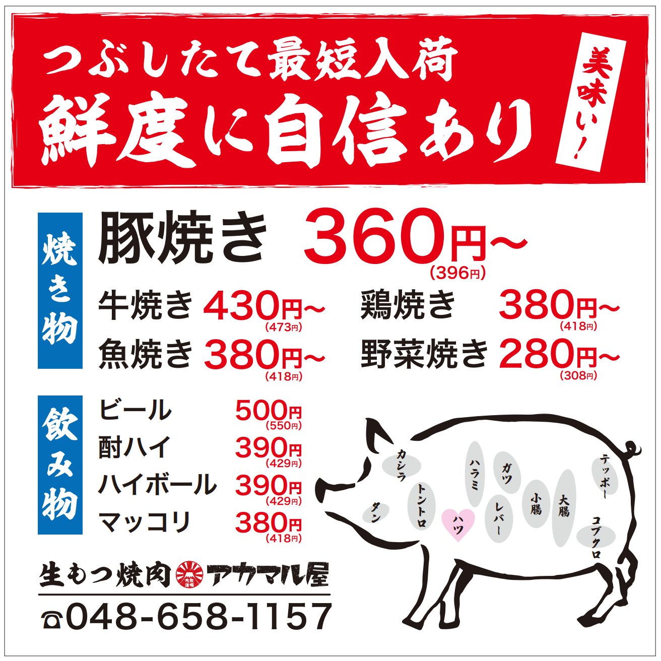 - 場所は産地直送の最短入荷の鮮度抜群!生もつ焼肉コンセプトのアカマル屋が大宮区にOPEN