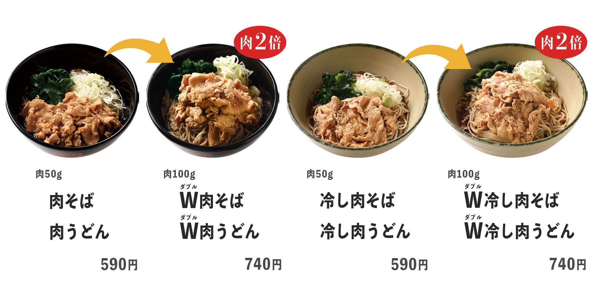 肉100g使用 「W肉そば」 「W肉うどん」 740円 |
