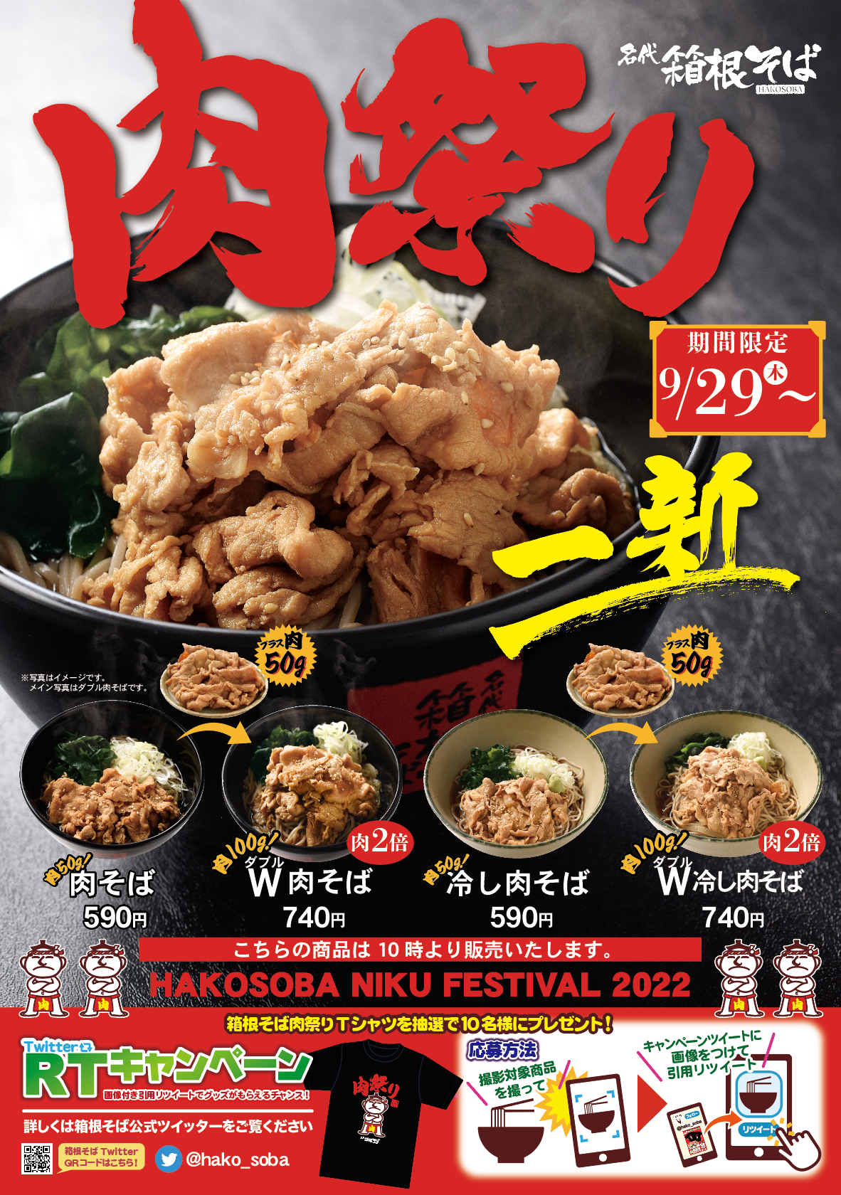あわせて「箱根そば肉祭りTシャツ」が抽選で10名様に当たるTwitterリツイートキャンペーンも実施いたしますので、奮ってご応募ください。