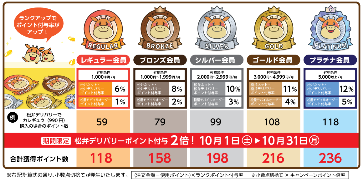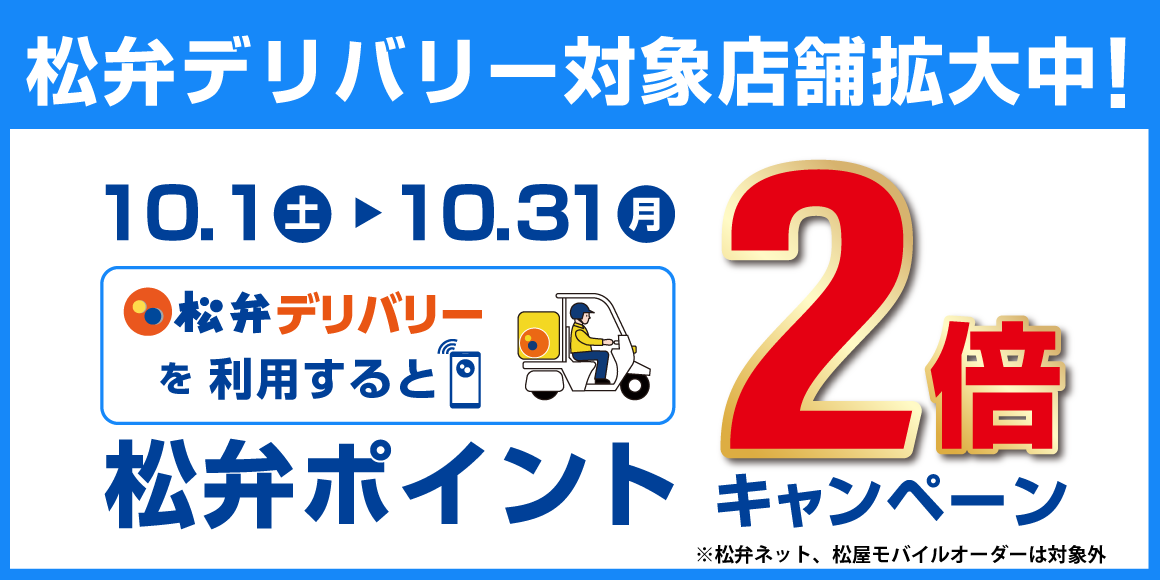 | ▽キャンペーン期間 2022年10月1日(土)~2022年10月31日(月) ▽注文受付時間 ▽対象店舗 松弁デリバリー導入店舗全店(松屋・松のや・松乃家・マイカリー食堂) ※10/1(土)より東京4店舗、大阪20店舗追加:https://bit.ly/2M39d7p ▽キャンペーン内容 ▽ポイントの利用 ▽新規会員ご登録で100ポイントプレゼント! ※クレジットカード・PayPay・LINE Pay・d払い・au PAY・メルペイによる事前決済と、お届け時の現金決済をご利用いただけます。 |