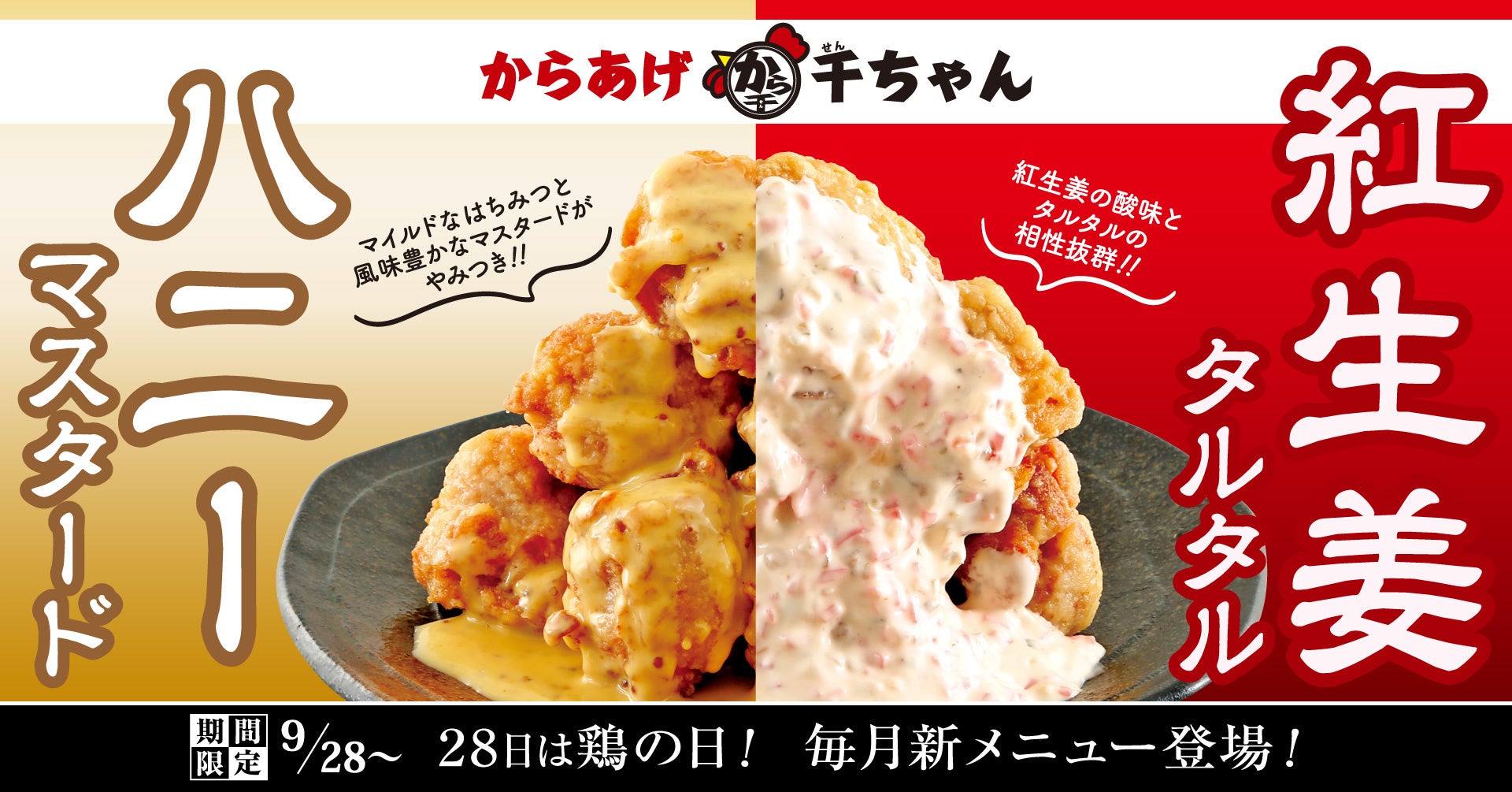 海鮮居酒屋「はなの舞」「さかなや道場」等を全国展開するチムニー株式会社(本社:東京都墨田区 代表取締役社長:茨田 篤司)は、 同社の「からあげ千ちゃん」にて、 同店の看板メニューである旨塩からあげに「ハニーマスタードソース」と「紅生姜タルタル」をトッピングした商品を、 期間限定で9月28日(水)より販売します。