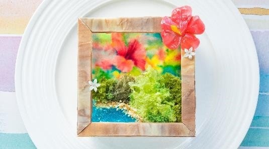 モダンなインテリアが特徴のカフェの席に座ると、カラフルな1枚の“絵画”が目の前に置かれます。これは、ハワイのオアフ島を拠点に活動するアーティスト「ローレン・ロス」の人気絵画作品「Jubilant(ジュービラント)」をモチーフにした、“食べられる絵画”です。ガラス皿の中にキャンバス役として洋酒香るムースの層をひき、額縁はチョコレートで木目を表現。実際の絵画を印刷した可食シートをメインに乗せ、山の部分はスポンジ、海や砂浜はゼリーとクランブルクッキー、ハワイの州花であるハイビスカスは飴細工を使って、「Jubilant」を皿の上に再現したヴェリーヌ(グラスデザート)です。本イベントのシンボルとして開発した期間・数量限定オリジナルスイーツで、ムースの甘味とフルーツの酸味、クッキーの香ばしさが入り交じり食べ進めるごとに味が変わる、見た目も味も楽しめるヴェリーヌに仕上げました。