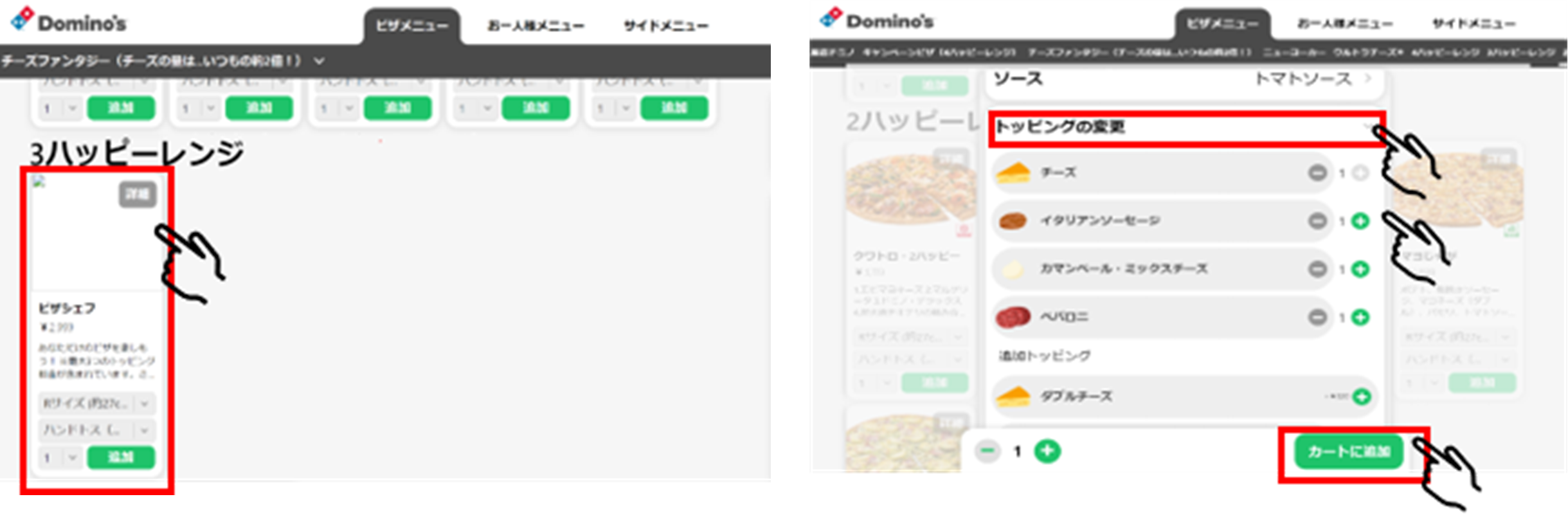 手順②:「追加トッピングの変更」からお好きなトッピングを選択し、カートに追加します。