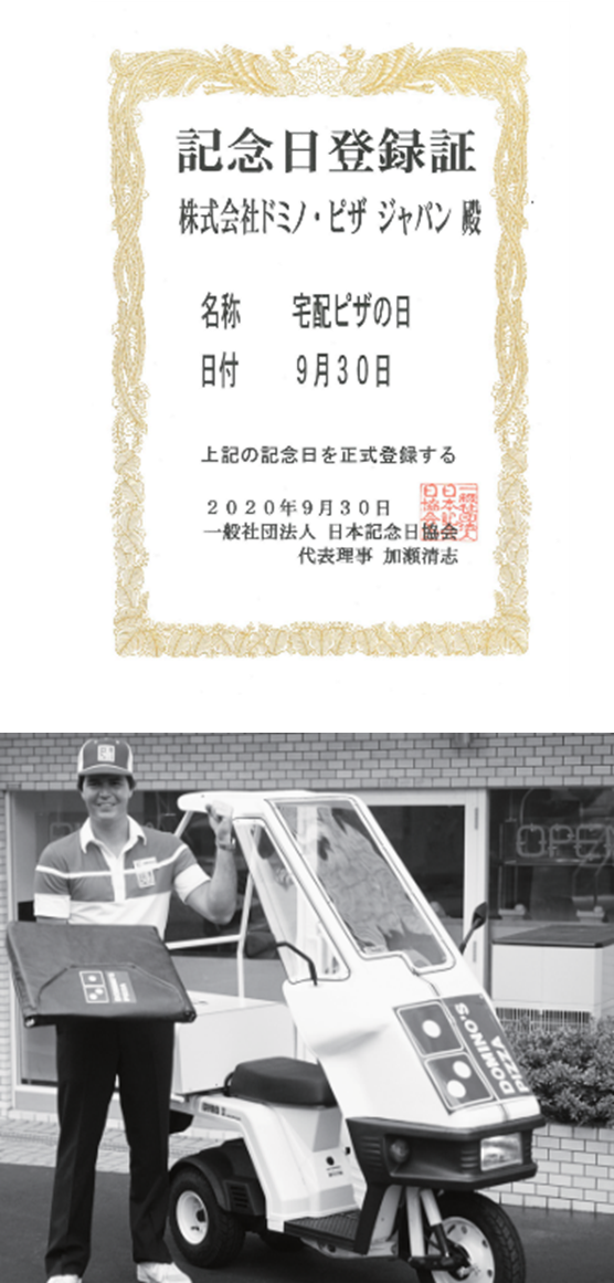 ドミノ・ピザ日本上陸35周年を迎えた2020年に、ドミノ・ピザ ジャパンの創業記念日であり、日本で初めて「宅配ピザ」というサービスがはじまった日でもある9月30日を「宅配ピザの日」と定め、(一社)日本記念日協会に認定・登録されました。