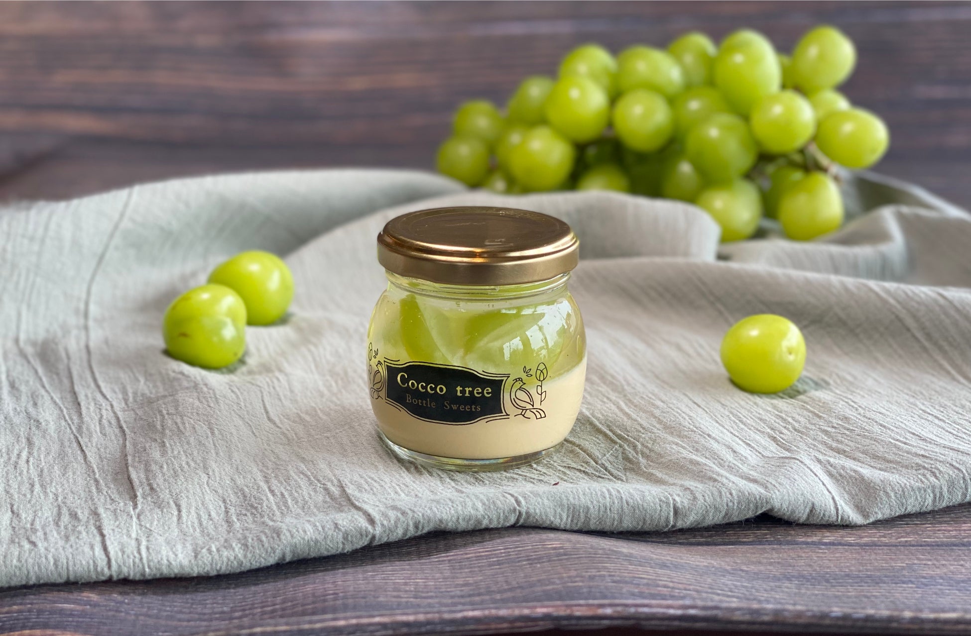 看板商品であるこだわりの材料と焼き時間で仕上げたとろ~りなめらかなぷりんと瑞々しい喜多方産のシャインマスカットをとじこめたつるんとしたジュレの相性は抜群です。期間限定のぷりんをどうぞお楽しみください。