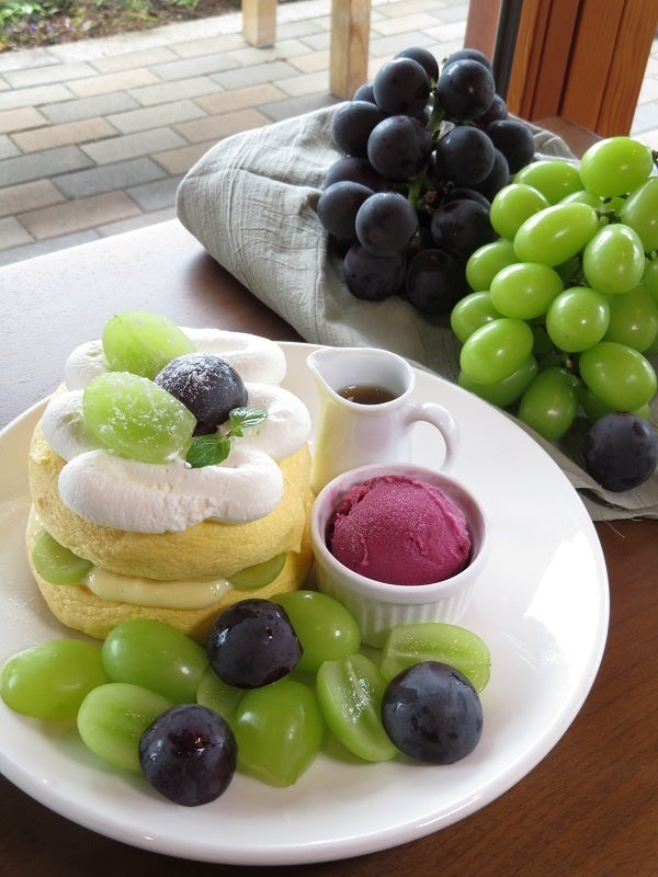 喜多方産のシャインマスカットとブドウを使用した、期間限定のスフレパンケーキやぷりんが登場します。