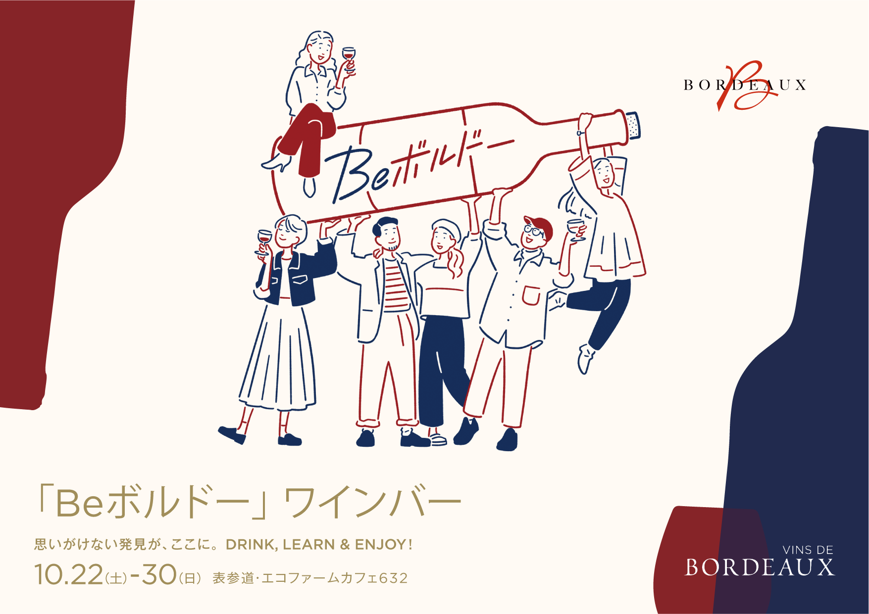 ボルドーワイン委員会(CIVB)は、2022年10月22日(土) – 30日(日)の9日間、東京・表参道の「エコファームカフェ632」(東京都渋谷区神宮前6 – 32 – 10)にて、エンターテイメント溢れるポップアップバー『「Beボルドー」ワインバー 思いがけない発見が、ここに。DRINK, LEARN & ENJOY!』 を開催いたします。
