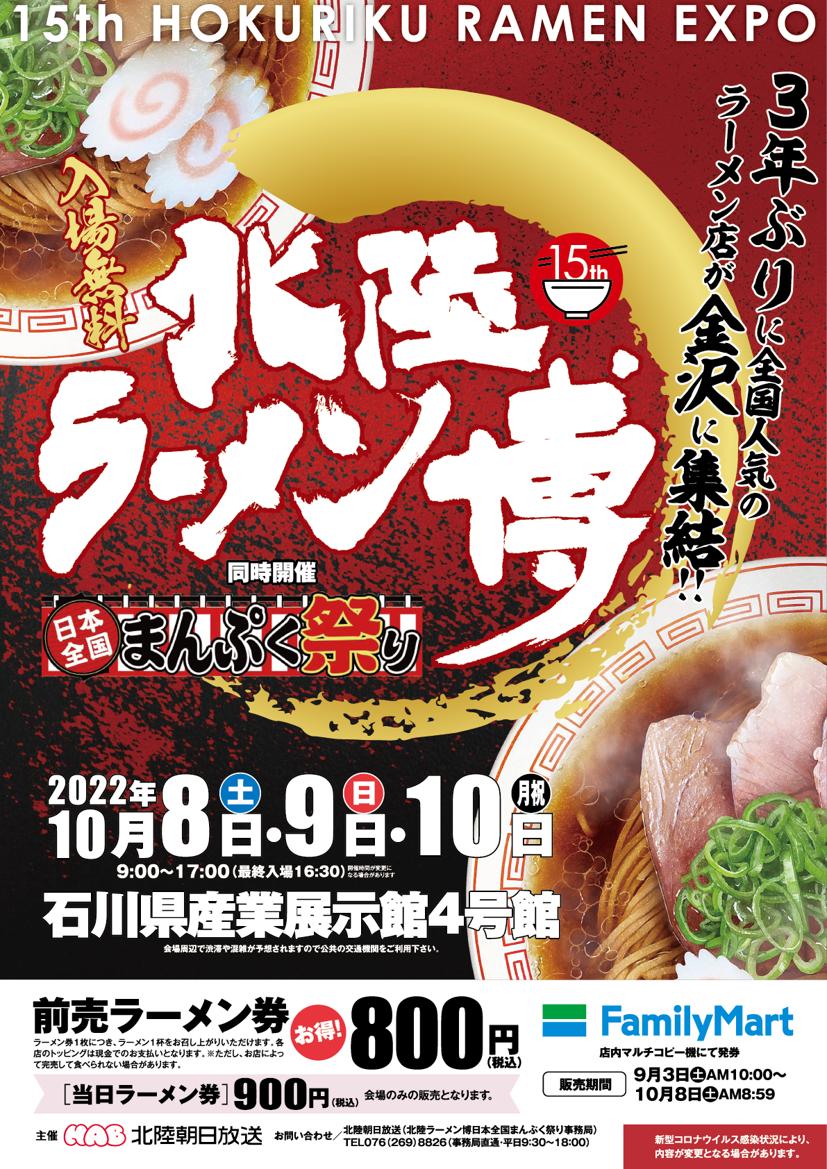北陸朝日放送(石川県金沢市、代表取締役社長 能田剛志)は、2022年10月8日(土)から10月10日(月・祝)の3日間、石川県産業展示館4号館にて、3年ぶりとなる「第15回北陸ラーメン博」を開催いたします。全国で人気のラーメン店が金沢に集結するこのイベント。今年は、人気・実力を兼ね備えたラーメン店10店が出店いたします。
