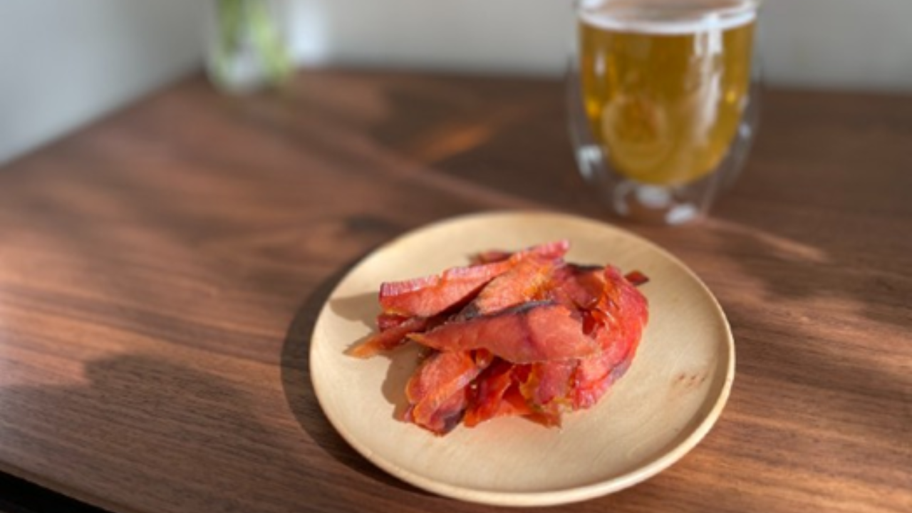 北海道産の鮭を使用し、化学調味料無添加で仕上げた、化学調味料では出せない自然の旨味を濃厚に味わえる 「鮭とば」 です。