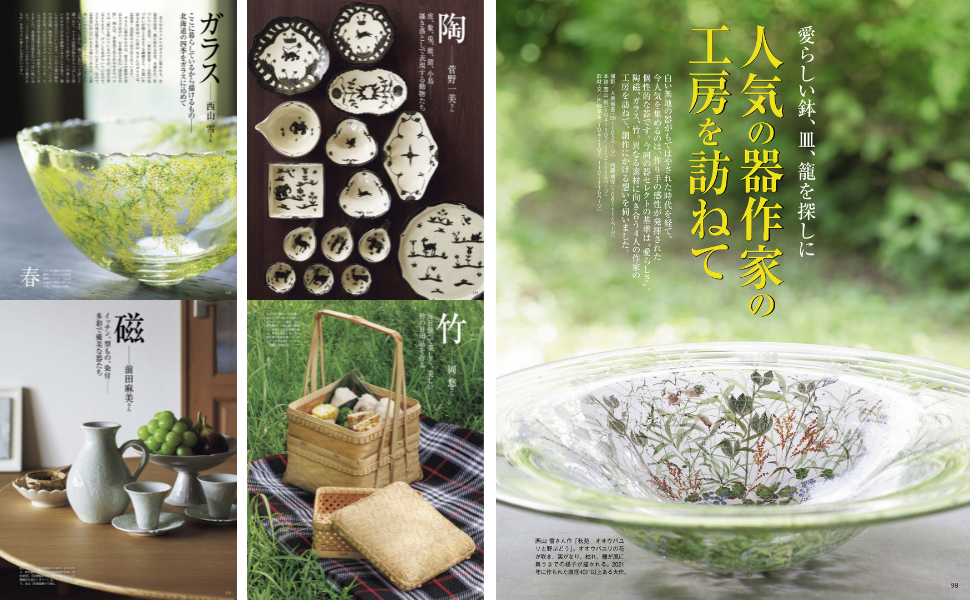 白い無地の器がもてはやされた時代を経て、今人気を集めるのは、作り手の感性が発揮された個性的な器です。今回の器セレクトの基準は“愛らしさ”。陶磁、ガラス、竹。異なる素材に向き合う4人の作家の工房を訪ねて、創作にかける想いを伺いました。