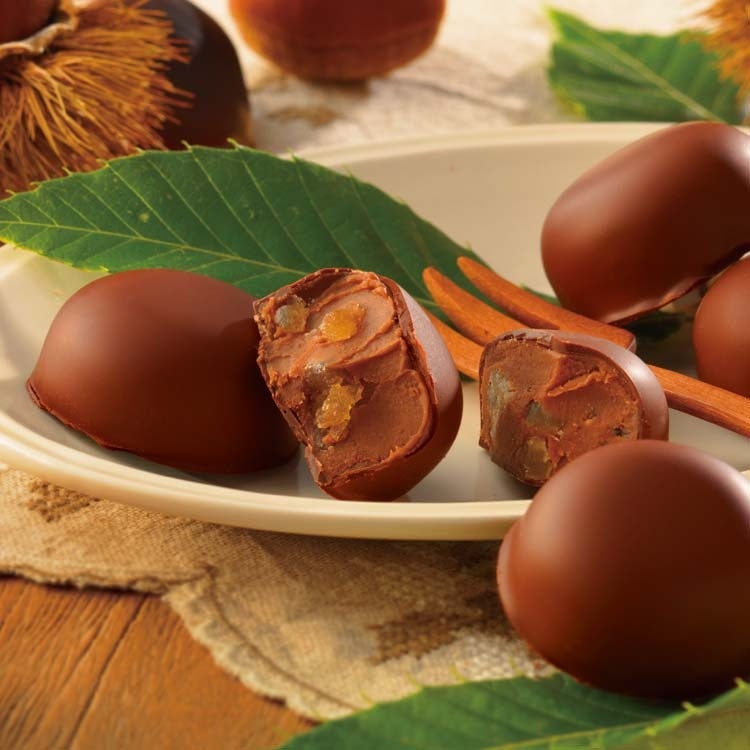 栗風味のなめらかなミルクチョコレートガナッシュにイタリア産の栗を使ったマロングラッセの粒を混ぜ込んで、甘さ控えめのチョコレートで包みました。隠し味の栗のリキュールが風味をさらに引き立てます。栗の上品な甘さと風味はカカオと相性抜群。贅沢なおいしさをお楽しみください。