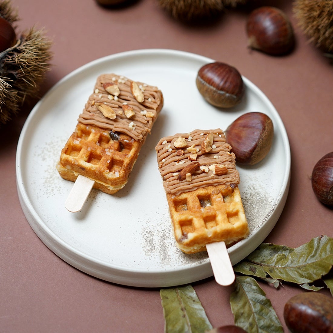 大粒ザラメが入った京ワッフルの生地には、甘く煮込んだ栗をたっぷりと練り込みました。焼き上がった生地には栗のペーストをふんだんに絞り、香ばしいアーモンドをトッピング。
