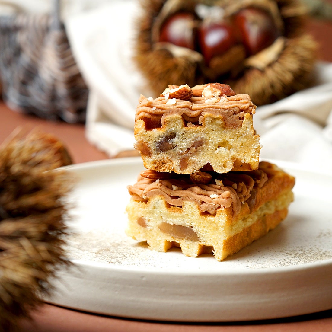 大粒ザラメが入った京ワッフルの生地には、甘く煮込んだ栗をたっぷりと練り込みました。焼き上がった生地には栗のペーストをふんだんに絞り、香ばしいアーモンドをトッピング。
