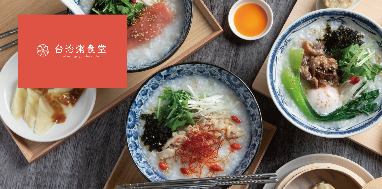 台湾粥食堂では、とろとろのルーローハンや優しい旨味の参鶏湯、海老ワンタン等の8種のお粥とサイドメニューでは点心・ごま団子等をご用意しています。